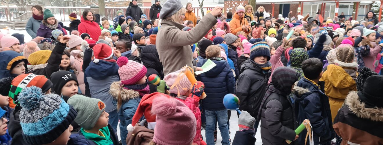 Am Nikolaustag versammelten sich die Vorschulklassen sowie die Schülerinnen und Schüler der ersten und zweiten Klassen um neun Uhr zu einem besonderen Ereignis auf dem Schulhof: dem 1. Adventssingen. Inmitten einer zauberhaft verschneiten Umgebung erklangen fröhliche Kinderstimmen, die gemeinsam Winter und Weihnachtslieder anstimmten. Begleitet wurden sie musikalisch von Frau Seibel am Keyboard und Frau Flügel an der Gitarre. Und auch die Vorschülerinnen und Vorschüler unterstützen die Musik mit Rasseln und Glöckchen, was die festliche Stimmung abrundete.