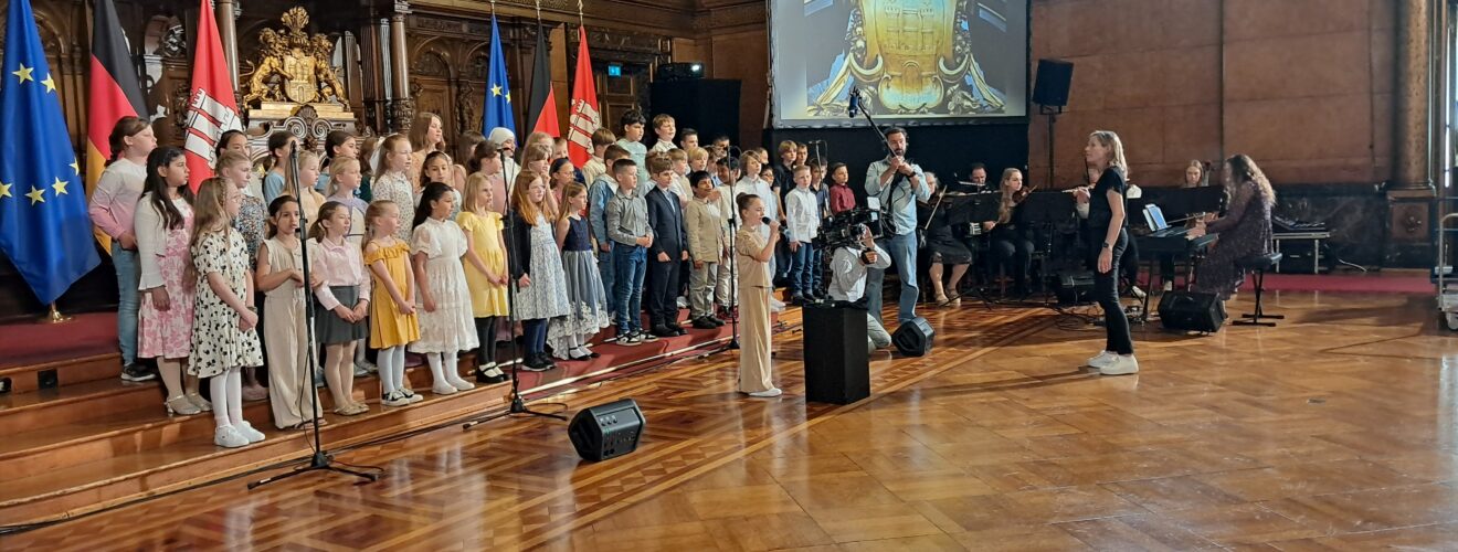 Am Freitag, den 16. Mai 2025, hatte der The Young ClassX – Chor einen ganz besonderen Auftritt: Im Hamburger Rathaus eröffnete er die feierliche Einbürgerungsveranstaltung mit den Liedern „Singen macht Spaß“ und „Baum des Lebens“. Unter der Leitung von Bettina Schuldt traten unsere knapp 50 Drittklässler im Laufe des Nachmittags insgesamt dreimal auf der Bühne auf und begeisterten das Publikum mit weiteren ausgewählten Liedern. Damit alle Abläufe gut funktionieren, wurde vor dem Auftritt nochmal konzentriert geprobt. Im Anschluss daran durften alle Kinder zur Entspannung noch eine kleine Rathausführung mitmachen.