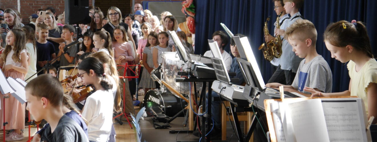 Die Besucher erlebten unsere drei Bühnen: die alte Turnhalle, den Mehrzweckraum und den Schulhof, wo unsere Instrumentalgruppen, die Chorkinder „Die kleinen Wirbelwinde“ und unser Orchester „Neugrabener Klangstrolche“ ihr Können präsentierten. Fast 100 Kinder waren in den Instrumentalgruppen aktiv, und wir waren stolz auf die Fortschritte, die sie gemacht hatten.