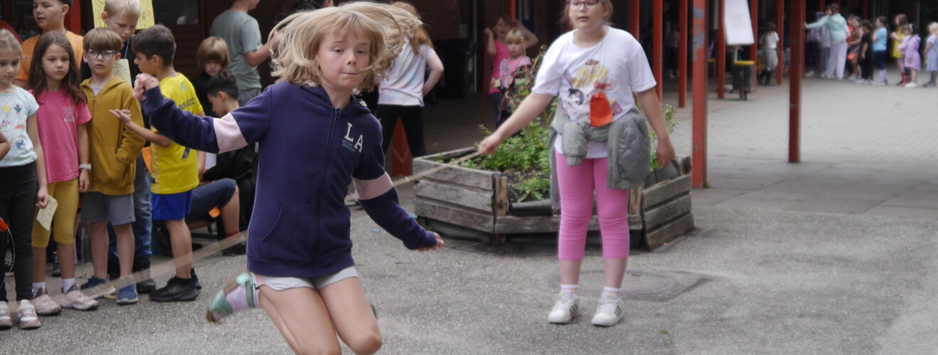 Am 21. Juli fand an unser Schule von 9 bis 11 Uhr das Spiele- und Sportfest statt. Der Schulhof verwandelte sich in ein buntes Spielfeld voller Aktivitäten.