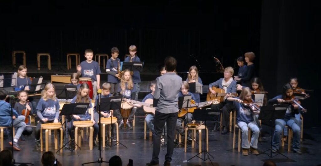 An diesem Abend musizierten Kinder verschiedener Jeki-Schulen gemeinsam mit Studierenden der HfMT. Dabei entfaltete sich das komplette Klangspektrum von Grundschul-Ensembles bis hin zum professionellen Orchester.