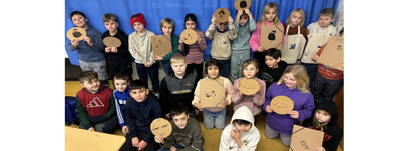 Dafür haben wir uns ein Video angeschaut von einer Künstlerin. So haben wir dann mit Hilfe des Films und der Lehrerinnen gelernt einen Siebdruck selber zu machen und wissen jetzt, wie es funktioniert. Für den Druck haben wir uns einen Gegenstand ausgesucht, zum Beispiel eine Mappe, eine Stofftasche oder eine Postkarte. Dann haben wir diesen Gegenstand auf den Tisch gelegt und uns eine eigene Sieb-Form ausgesucht. Es gab viele schöne Bilder: Einen Otter, einen Pinguin, Vögel, eine Katzen-Birne oder ein Wal. Wir haben dann die Farbe auf das Sieb aufgetragen und mit der Rakel, so heißt das Werkzeug, über das Motiv gezogen. Unser bedruckter Gegenstand musste über Nacht trocknen und am nächsten Tag konnten wir die schönen bedruckten Sachen mit Nachhause nehmen.