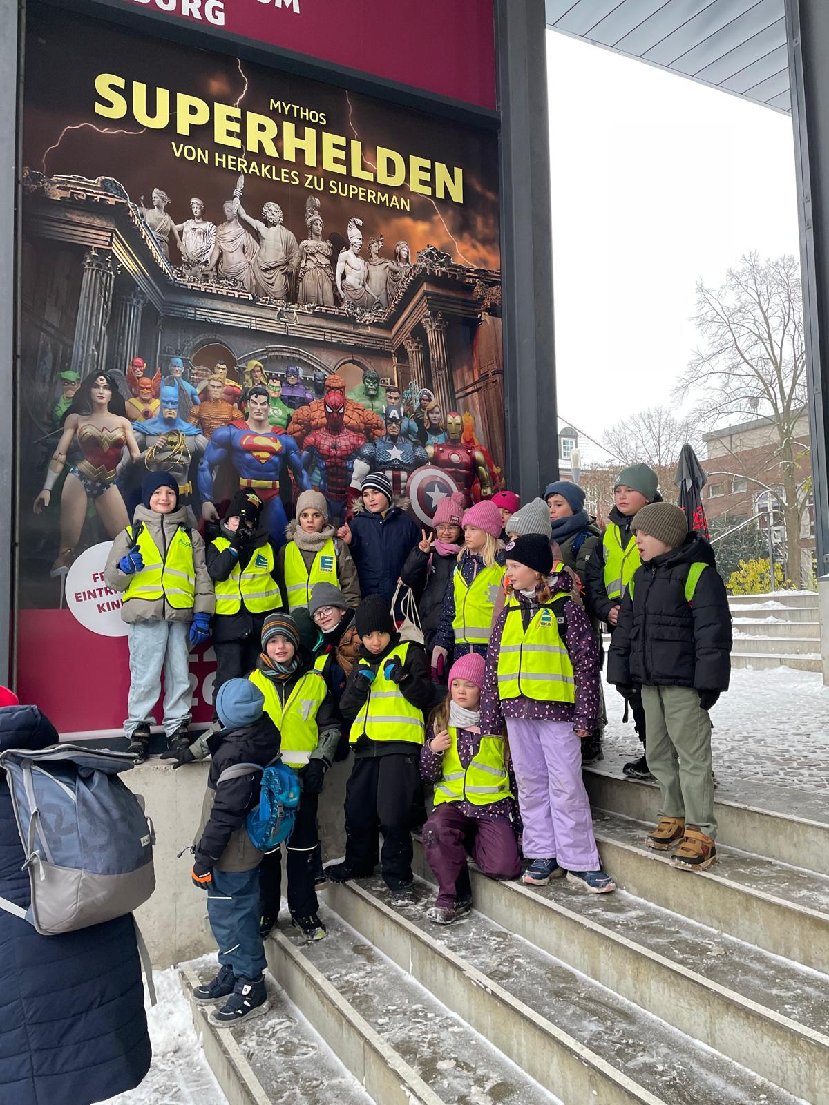 Die Klasse 2a hat im Rahmen des Projektes "Superheldinnen und Superhelden" die Ausstellung „Mythos Superhelden“ im Archäologisches Museum Hamburg besucht. Die Ausstellung zeigt eine Fülle von Superhelden-Comics sowie Superhelden-Figuren aller Art. Die Kinder tauchten an dem Tag in eine faszinierende Phantasiewelt, in der Menschen fliegen, Magnetfelder kontrollieren und Wände erklimmen! Insbesondere haben die Kinder dabei festgestellt, dass jeder Superkräfte hat,